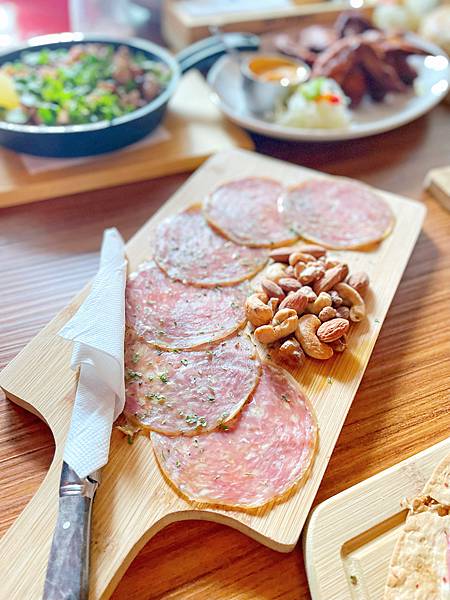 薩拉米臘腸可以直接配紅酒食用。 ABV使用西班牙道地的風乾臘腸。 旁邊還有非常豐富的堅果🌰很適合配著酒~