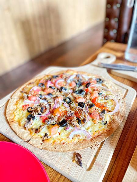 薄皮的披薩~脆脆的,上面有油漬沙丁魚配上蒜味鯷魚奶油醬,再搭上牛番茄與紫洋蔥,最後再撒上起司最後再刨上黃檸檬皮增添一番清香。