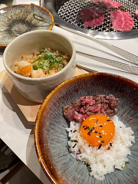 主食可以選釜飯系列(我超推那個海蝦釜鍋飯,爆香的),還有那個「和牛油月見拌飯」,一拌下去真的香到不行~鹹香濃郁還帶一點奶滑感,直接封神。