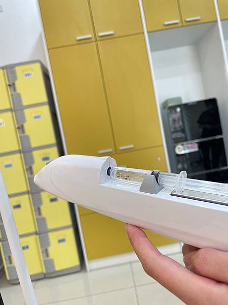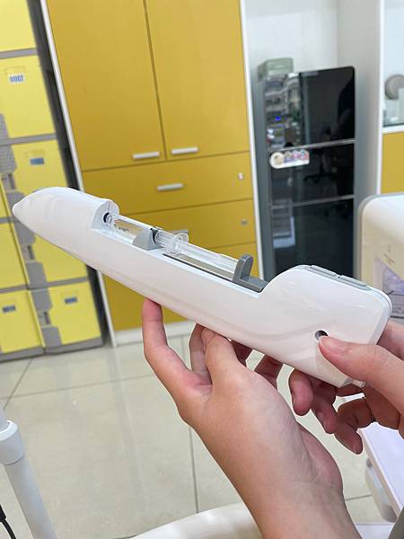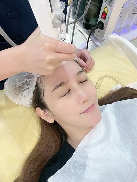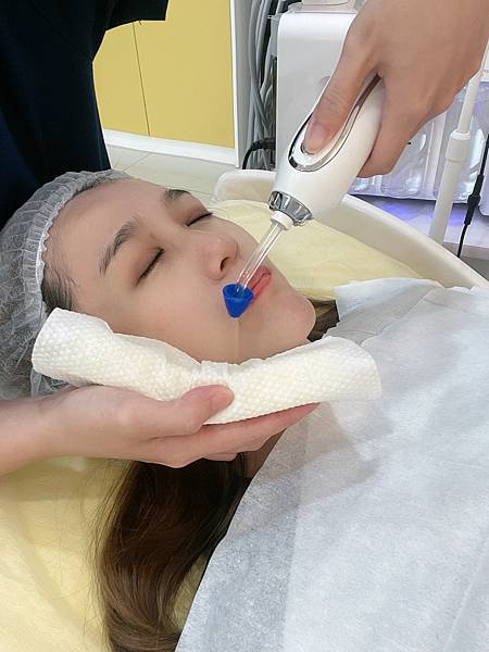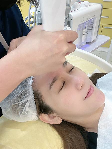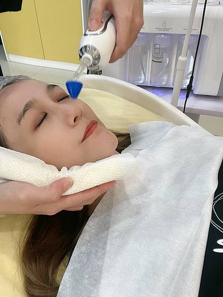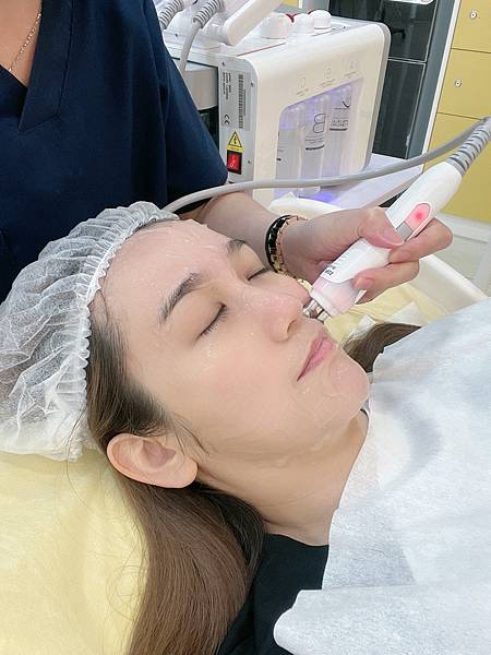 接下來開始用特殊的無針水光儀,打入盈潤補水的保養品,很像很強的細小空氣槍,超高速噴射不斷地將營養打入皮膚底層內呢!